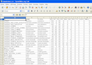 "blue ghost","blue ghosts",125,5,99,10,1,5,0,8,0,0,25,"Gobble Gobble."The vanilla GameActors.csv file now looks like this in Open Office: