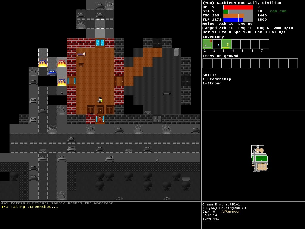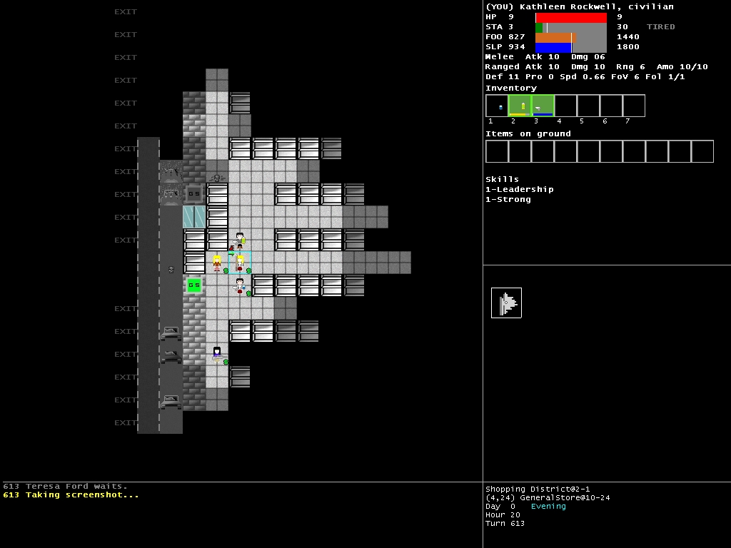 Teresa Ford is eager to tag along and together we flee my district to the east. Lots of shops there. We get into one and I decide to push shelves around to barricade the place. Night has fallen, we'll get some rest here. Other people had the same idea apparently.